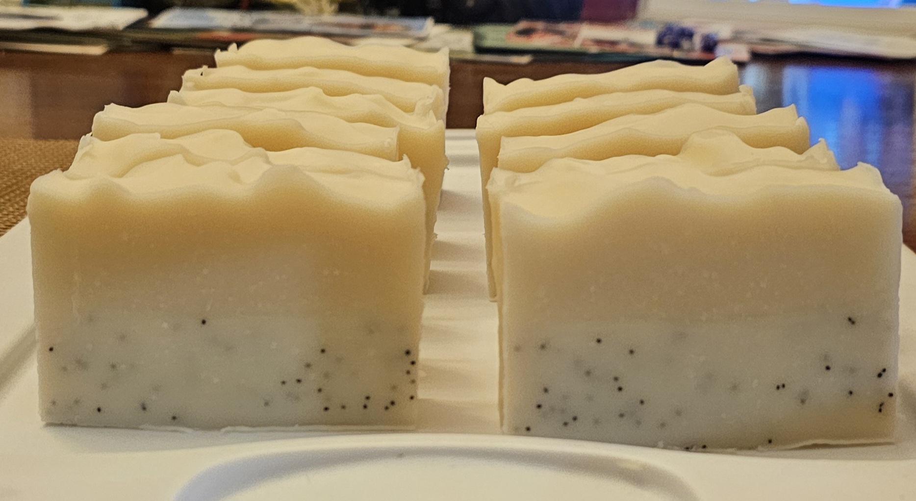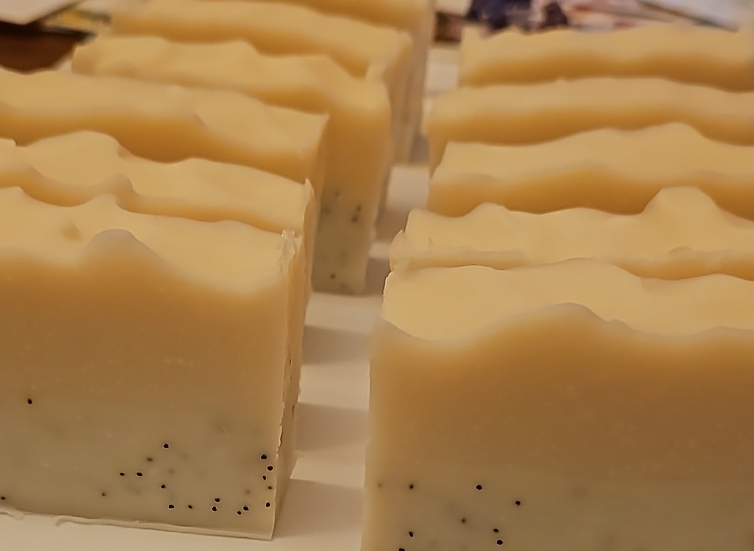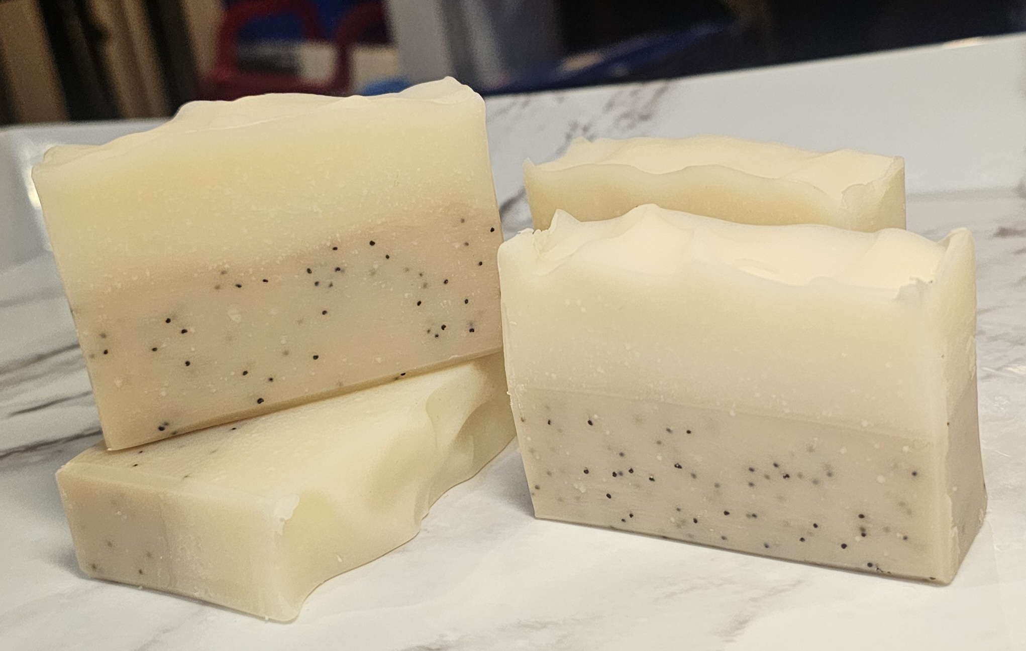 Ingredients: olive oil, coconut oil, organic fair trade shea butter, sodium hydroxide [converts oils to soap], Castor Oil, vanilla, sandalwood essential oil, sugar [adds sugar naturally] & and poppy seeds to naturally exfoliate.